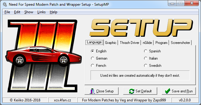 This is a tool made by Keiiko which allows you to quickly setup thrash driver, some nGlide options and more. It can work with NFS2, NFS3 and NFS4, just put it into the game root directory and run it. Note that you need to have "VEG" patched game in order to use it.
